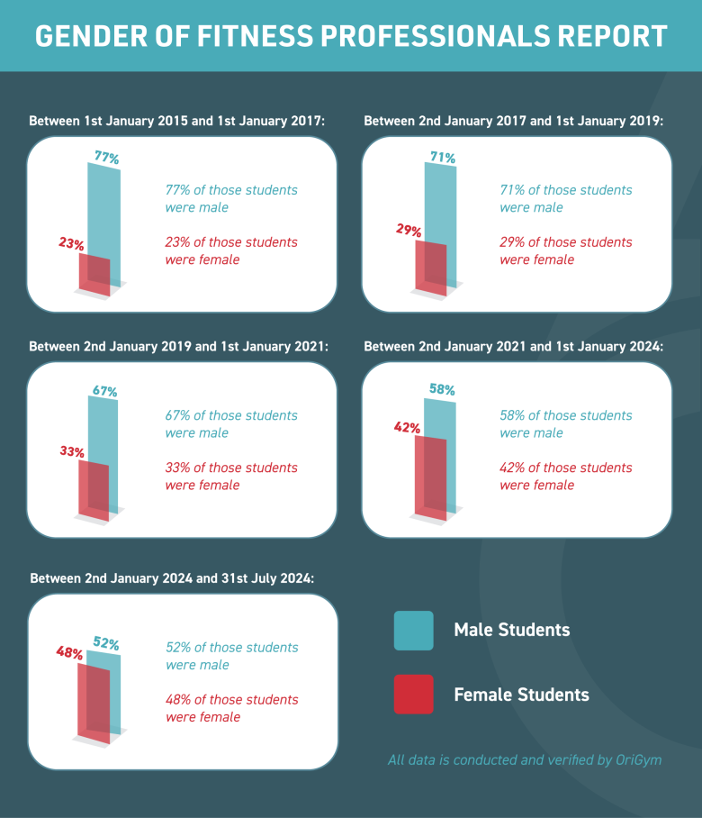 Active Careers has collaborated with OriGym, a training provider in fitness qualifications across the UK to find out if there has been a change in gender demographic over the past 9 years of the percentage of women vs men getting qualified as a Personal Trainer in the UK.